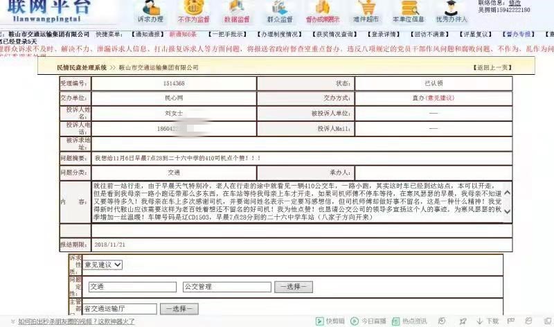 劉女士在反饋件上寫到:各位相關(guān)領(lǐng)導(dǎo),你們好!事情的經(jīng)過是這樣:我母親早晨在鐵西八家子等車,由于不知道八家子這個站點已經(jīng)不停站,等了30多分鐘,經(jīng)過好心人的提醒就往前一站行走,由于早晨天氣特別冷,老人在行走的途中就看見一輛410公交車,一路小跑,其實這時車已經(jīng)到達站點,本可以開走,但是看到我母親一路小跑還帶那么多東西,在車站等待我母親上車才開走,如果司機師傅不停車等待,在寒風(fēng)瑟瑟的早晨,我母親不知道又要等待多久!我母親在車上多次感謝司機,并要詢問姓名表示一定要寫感想信,但司機師傅卻做好事不留名,這是一種什么精神!我覺得新時代鞍山應(yīng)該需要這樣為老百姓著想還不留名的好司機!我為他點贊!也懇請公交公司的領(lǐng)導(dǎo)多宣揚這個人的事跡,為寒風(fēng)瑟瑟的秋季增加一絲溫暖!車牌號碼是遼CD1503,早晨7點28分到的二十六中學(xué)車站(八家子方向開來)。