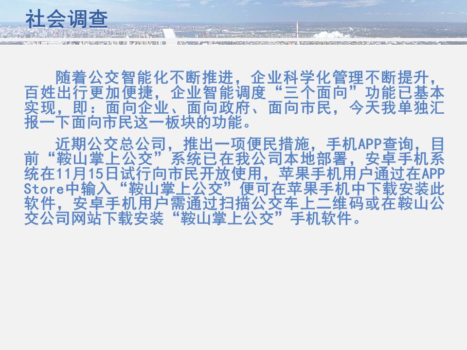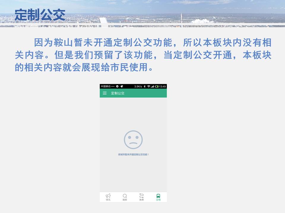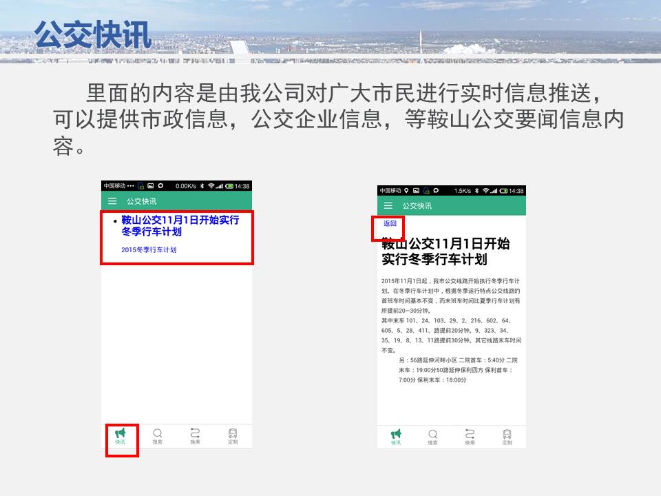 點(diǎn)點(diǎn)手機(jī)就可以看到公交車目前所在的位置,精準(zhǔn)地掐好出門時(shí)間,從而避免在惡劣天氣或高峰期苦苦候車,工作人員坐在調(diào)度室內(nèi)就能掌握車輛在路上的運(yùn)行情況……為方便廣大市民出行,基于安卓平臺(tái)開發(fā)的“鞍山掌上公交”官方APP將于11月15日正式上線試運(yùn)行,適用于蘋果IOS系統(tǒng)的APP將于明年初上線,市民可在公共交通總公司官網(wǎng)下載該軟件,并實(shí)現(xiàn)37條公交線路車輛實(shí)時(shí)查詢的便利服務(wù)。